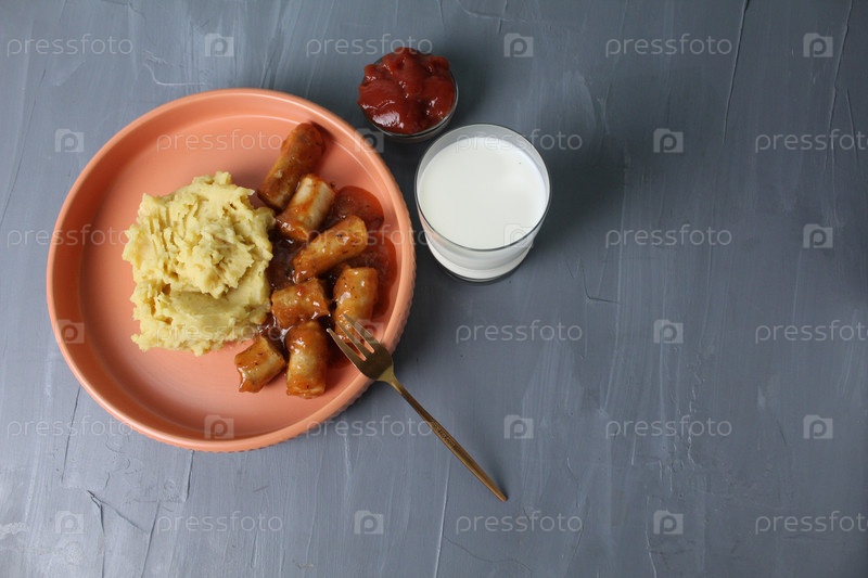 Домашний обед. Картофельное пюре, сосиски, сосиски, молоко и кетчуп, томатная паста на сером фоне, вид сверху, копировальное пространство, место для текста. Приятного аппетита