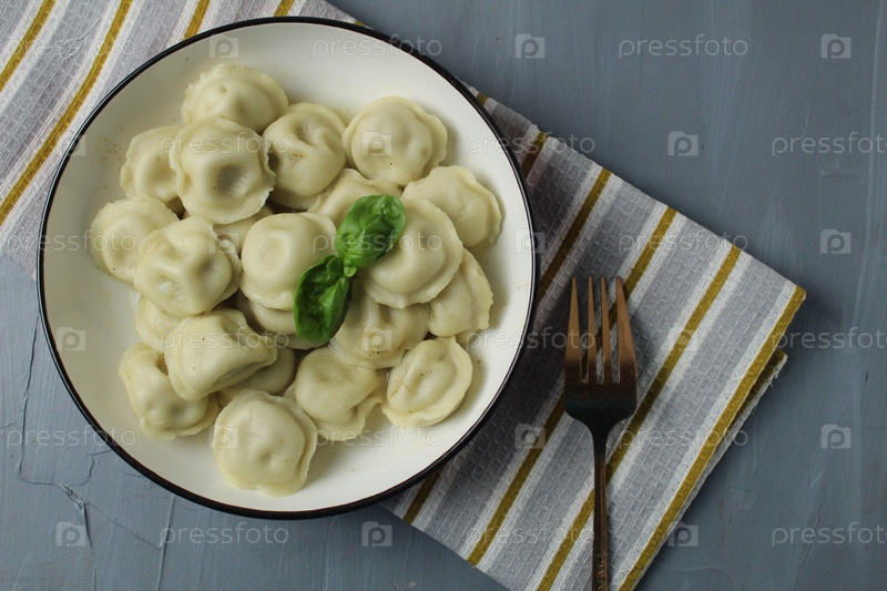 Подача ужина с пельменями в миске с вилкой и салфеткой, вид сверху. Концепция вкусной простой национальной еды