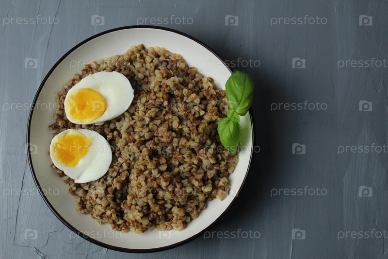 Гречневая каша с куриным яйцом, базиликом, вид сверху. Концепция здорового питания