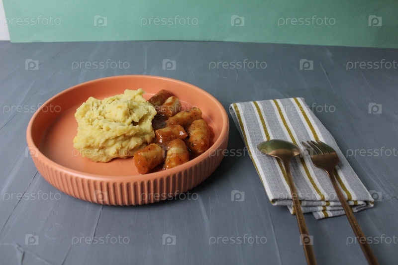 Обед: картофельное пюре, колбаски с томатным соусом, вилка, ложка на салфетке на сером фоне. Вид сбоку