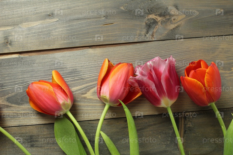 Красные оранжевые тюльпаны внизу на сером деревянном фоне с местом для текста. Весенний фестиваль