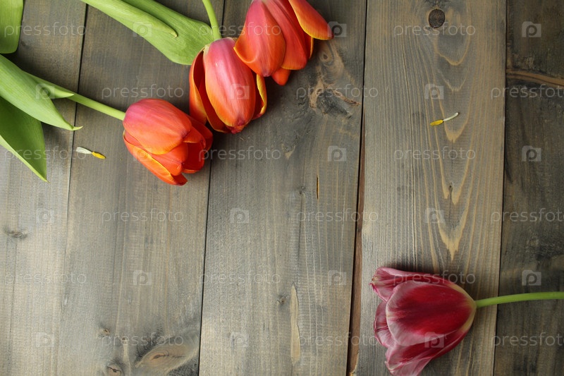 Тюльпаны на сером фоне с местом для текста. Вид сверху. Копирование пространства. Весенние цветы
