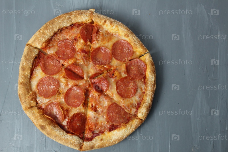 Круглая пицца пепперони на сером фоне Верхний угол с пространством для текста. День пиццы