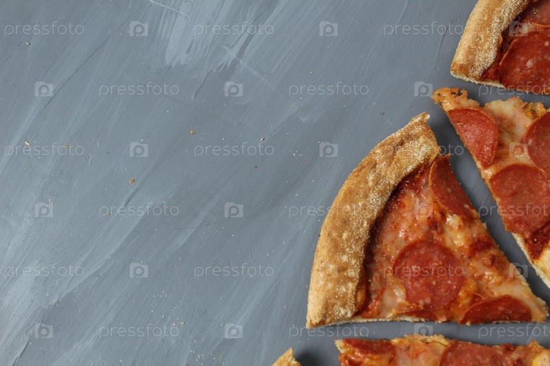 Ломтики пиццы Пепперони на сером фоне с местом для текста, вид сверху