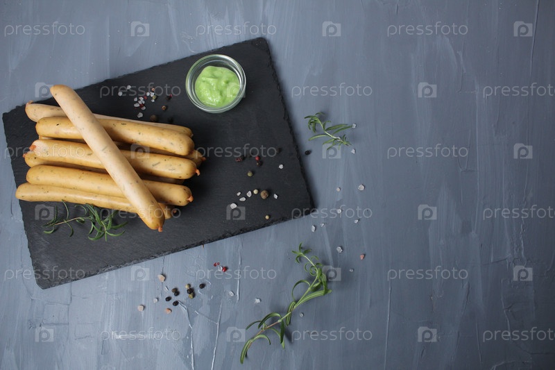 Вкусные вегетарианские или веганские колбаски с солью, специями и травами на темном бетонном фоне