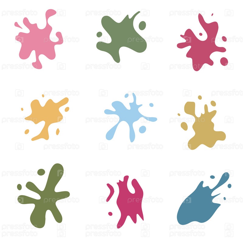 Набор красочных брызг. Яркие пятна, краска, набор элементов дизайна. Красочный набор брызг краски. Круглая плоская коллекция всплесков, жидкости декоративных форм. Различные брызги и капли