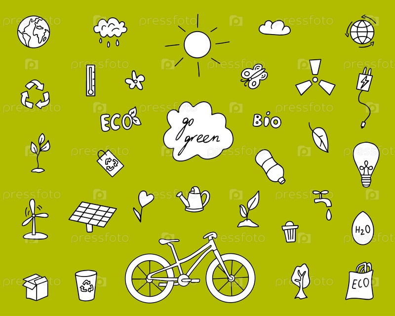 Экологический набор каракулей. Эко в линейном стиле, нарисованном вручную. Концепция Дня Земли, 22 апреля, векторный набор элементов. Сохраните землю, глобус, символ переработки в простом стиле рисования каракулей. Экологически чистый минимальный дизайн д