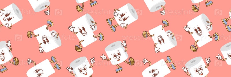 Бесшовный узор с милыми мультяшными рулонами туалетной бумаги с лицами в стиле Каваи. Векторная иллюстрация