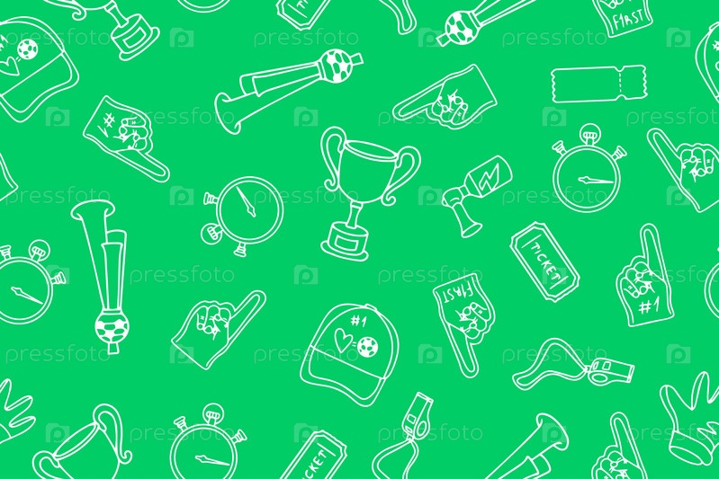 Бесшовный узор с атрибутами футбола и болельщиков. Ручные футбольные символы. Вектор