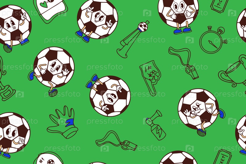 Бесшовный рисунок милых забавных счастливых персонажей футбольного мяча и атрибутов футбола и болельщиков. Нарисованные вручную персонажи мультфильмов Каваи. Векторная иллюстрация