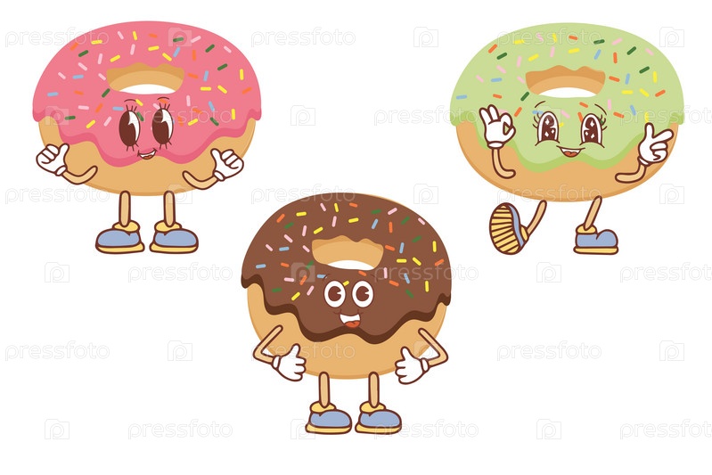Милый пончик в стиле каваи с посыпкой и глазурью. Симпатичные персонажи мультфильмов. Векторная иллюстрация