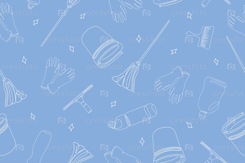 Бесшовный рисунок чистящего оборудования. Иконки линий очистки. Линия рисованного оборудования, чистящих средств и инструментов для мытья окон и различных поверхностей