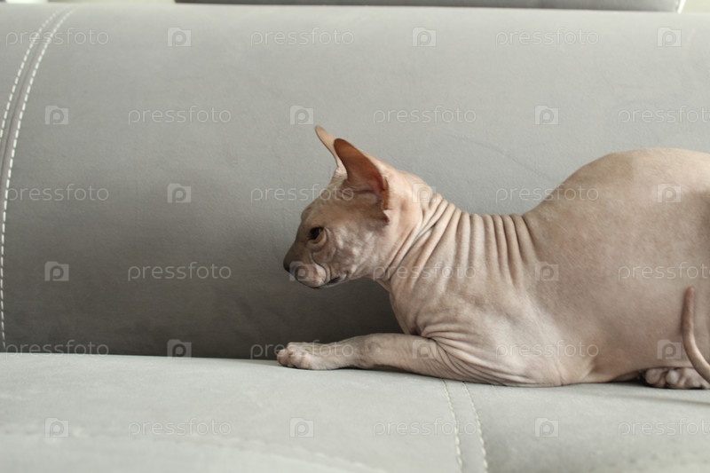 Хищный кот готовится к прыжку. Играющие кошки охотятся. Сфинкс на сером фоне с местом для текста