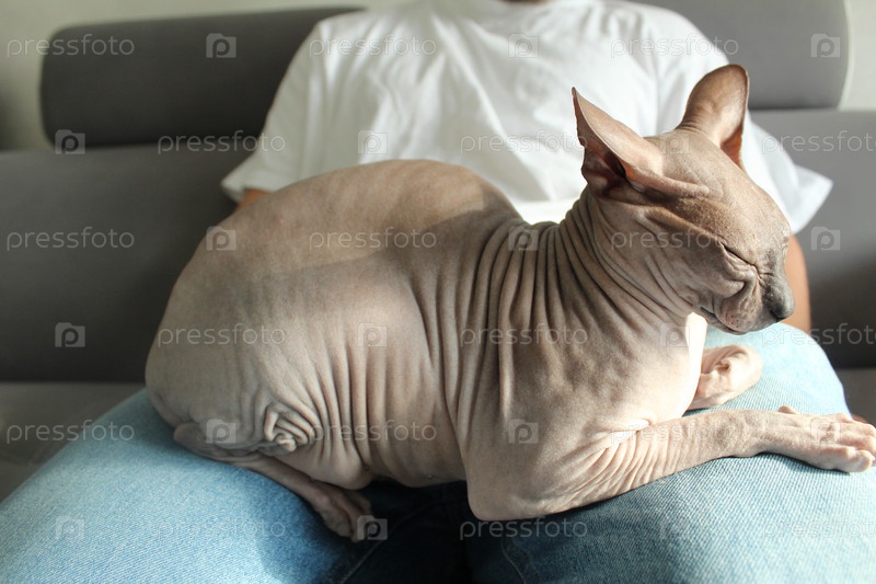Серый кот на коленях у хозяина. нежность, любовь, признание домашних животных. Мужчина и домашняя кошка