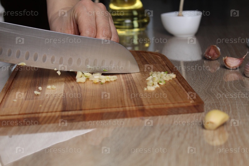 Девушка режет чеснок под боковым углом. Блюда с добавлением чеснока, острая кухня