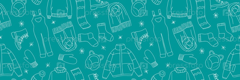 Теплая осенняя и зимняя одежда бесшовный узор в стиле каракулей. Векторная коллекция теплой, уютной одежды и обуви. Сезонная одежда бесшовный фон. Векторная иллюстрация