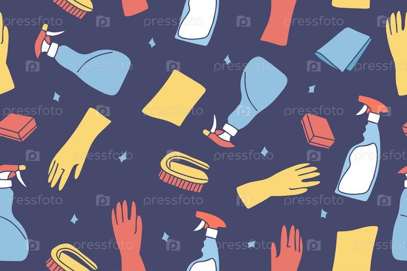 Бесшовный рисунок чистящего оборудования. Иконки линий очистки. Линия рисованного оборудования, чистящих средств и инструментов для мытья окон и различных поверхностей