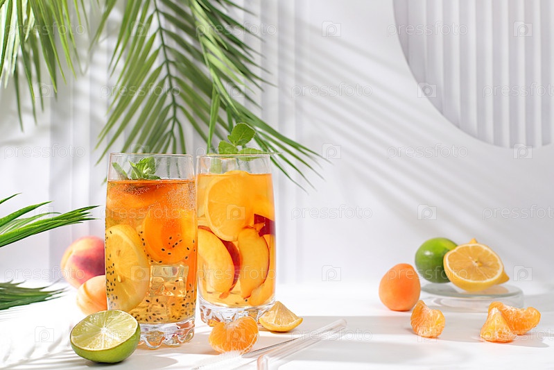 Ледяной домашний лимонад или коктейль с мятой, абрикосами, персиками, семенами чиа и цитрусовыми, рецепт освежающего летнего напитка, детокс-диета и концепция похудания, меню для ресторана,