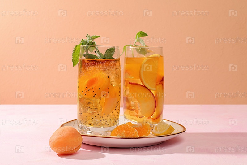 Ледяной домашний лимонад или коктейль с мятой, абрикосами, персиками, семенами чиа и цитрусовыми, рецепт освежающего летнего напитка, детокс-диета и концепция похудания, меню для ресторана,