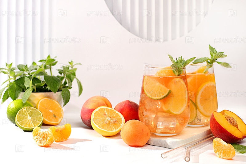 Ледяной домашний лимонад, сок или коктейль с мятой, абрикосами, персиками и цитрусовыми, рецепт освежающего летнего напитка, детокс-диета и концепция похудания, меню для ресторана,