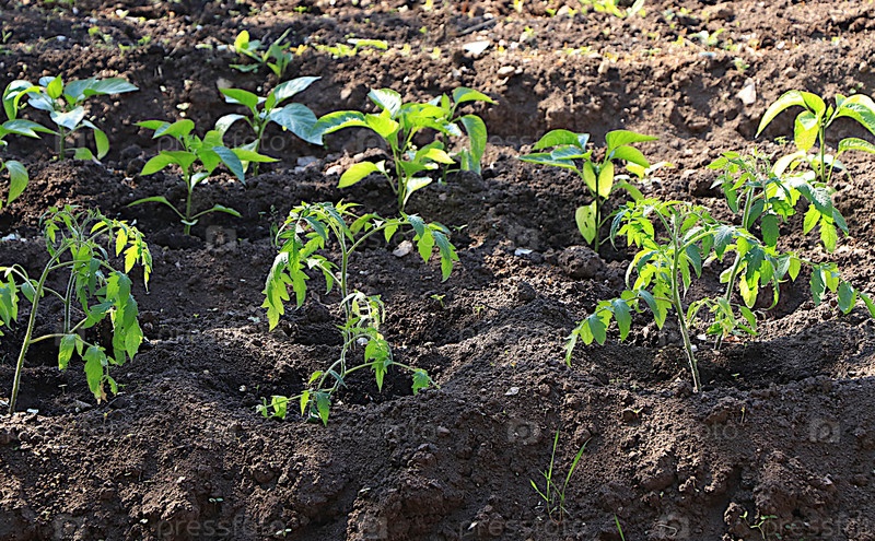 Выращивание помидоров в деревне в центральной России. Над грядкой расставляют арки и высаживают туда рассаду, накрывая на ночь пленкой. Концепция экопродуктов, натуральных продуктов питания без ГМО, сельского образа жизни