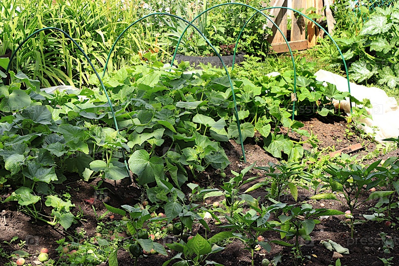 Выращивание огурцов в деревне в средней полосе России. Над грядкой расставляют арки и высаживают туда рассаду, накрывая на ночь пленкой. Концепция экопродуктов, натуральных продуктов питания без ГМО, сельского образа жизни