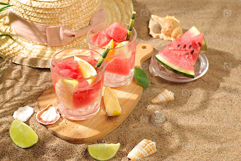 Ледяной домашний лимонад или коктейль с мятой, арбузом и фруктами на песчаном пляже, рецепт освежающего летнего напитка, детокс-диета и концепция похудания, меню для ресторана,