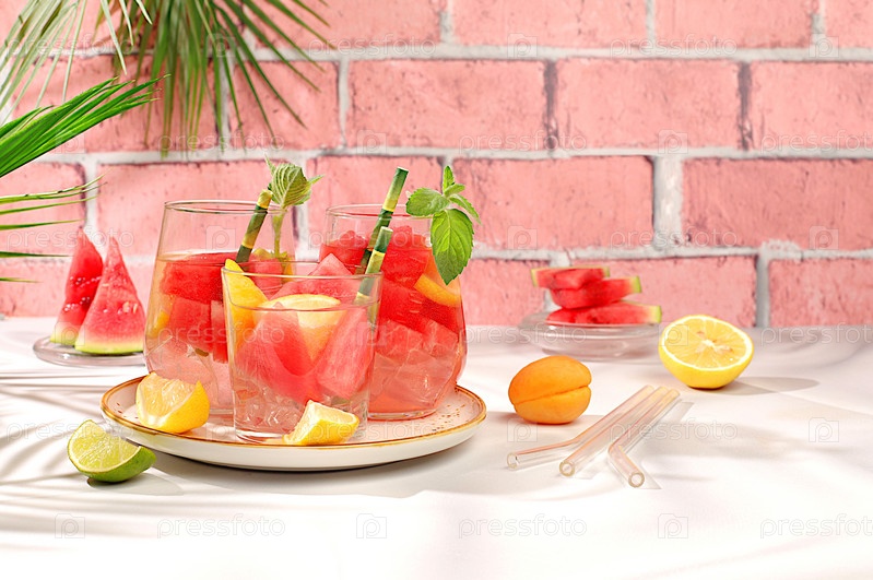 Ледяной домашний лимонад или коктейль с мятой, арбузом и фруктами — рецепт освежающего летнего напитка. Два стакана с фруктовым напитком на солнечном столе, детокс-диета и концепция похудения, меню для ресторана,