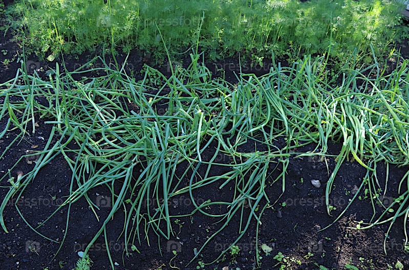 Грядка со спелым луком. Выращивание овощей в деревне в центральной России. Концепция экопродуктов, натуральных продуктов питания без ГМО, сельского образа жизни