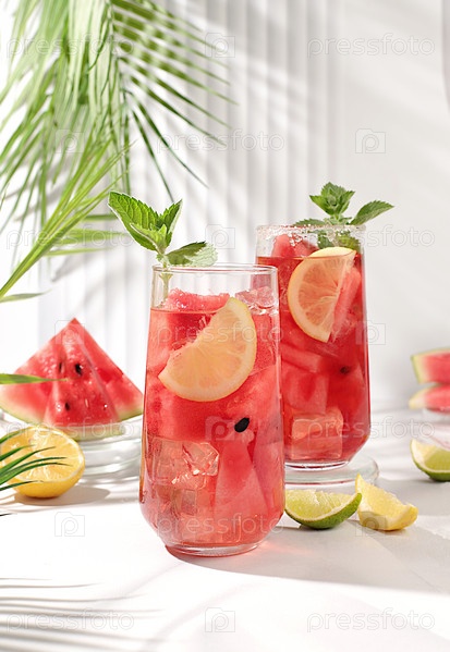 Ледяной домашний лимонад или коктейль с мятой, арбузом и фруктами на солнечном столе, рецепт освежающего летнего напитка, детокс-диета и концепция похудания, меню для ресторана, избирательный фокус