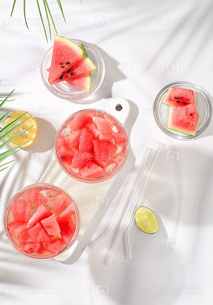 Арбузный замороженный коктейль Маргарита со свежими кусочками арбуза, лайма и мяты, концепция летней вечеринки и отпуска, реклама бара, кафе, избирательный фокус