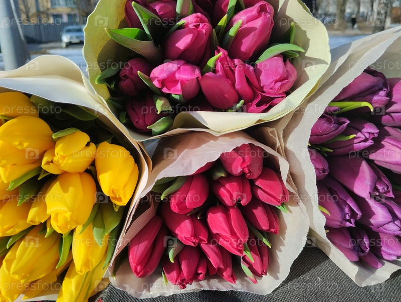 Букеты тюльпанов в бумажной крафт-упаковке крупным планом. Цветочный фон тюльпана