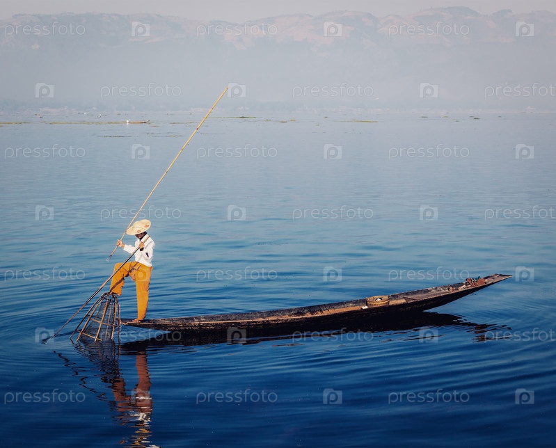 Туристическая достопримечательность Мьянмы — традиционный бирманский рыбак на озере Инле, Мьянма, известный своим характерным стилем гребли на одной ноге. Винтажное изображение в стиле хипстера с ретро-эффектом