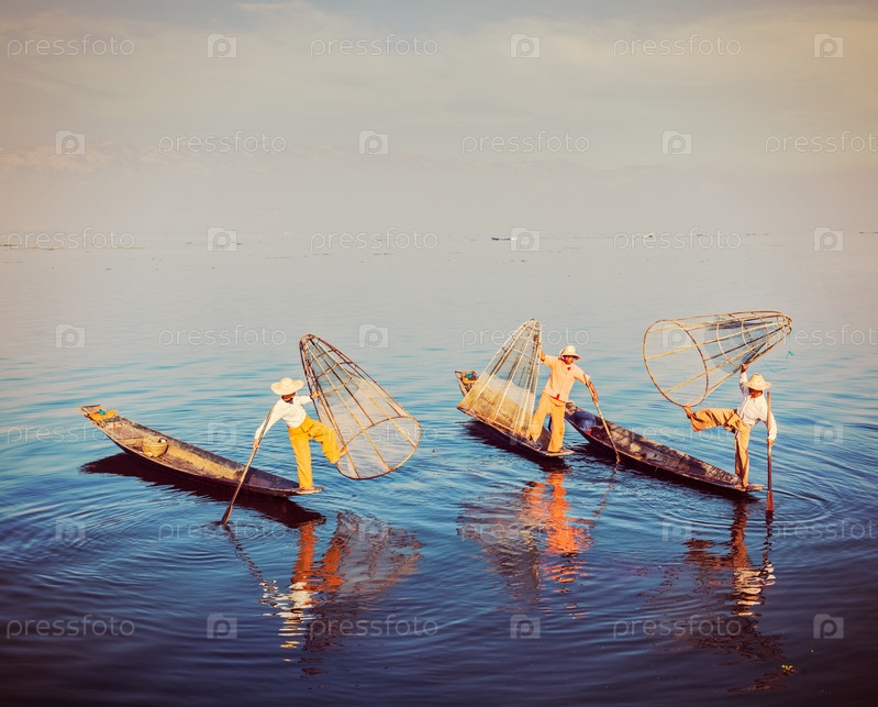 Туристическая достопримечательность Мьянмы — традиционные бирманские рыбаки, балансирующие на лодках с рыболовной сетью на озере Инле в Мьянме, известные своим характерным стилем гребли на одной ноге. Винтажное изображение в стиле хипстера с ретро-эффекто