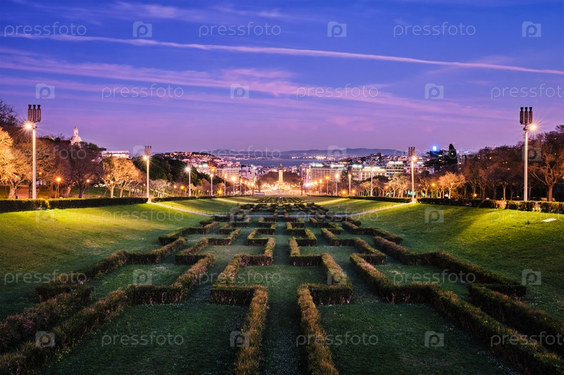 Вид на площадь маркиза Помбала в Лиссабоне из парка Эдуарда VII ночью, Португалия