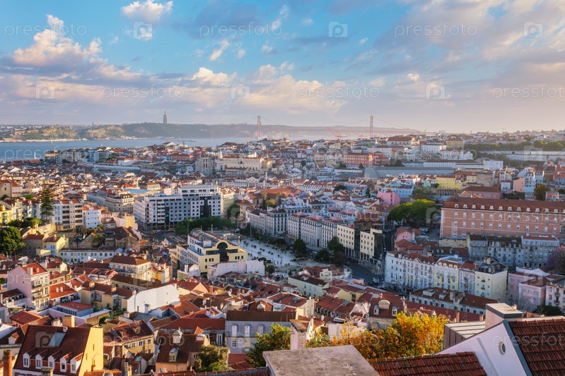 Вид на закат Лиссабона со смотровой площадки Мирадуро-да-Сеньора-ду-Монте. Лиссабон, Португалия
