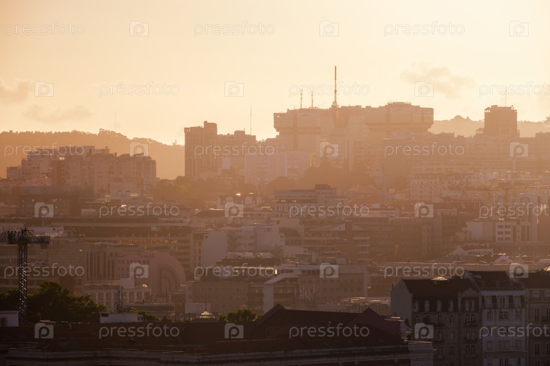 Вид на Лиссабон на закате со смотровой площадки Мирадуро-да-Сеньора-ду-Монте. Лиссабон, Португалия