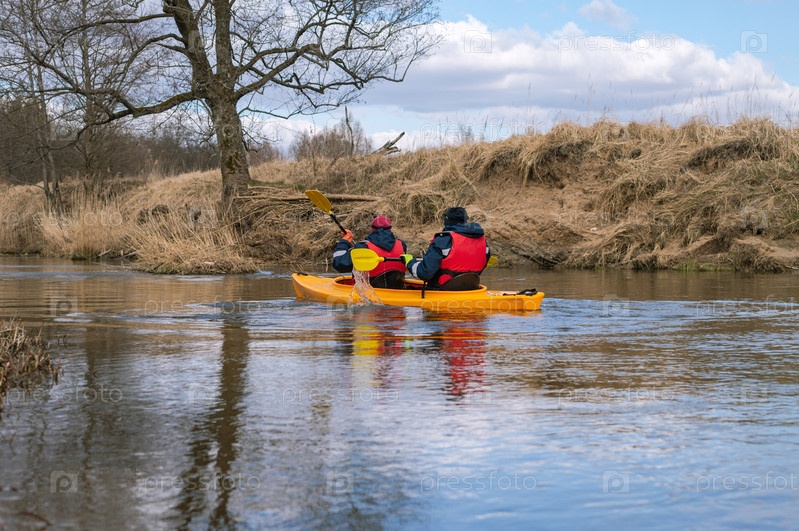 Калининград, Россия - 2022, 3 апреля: Люди в возрасте проводят весенние каникулы на природе. Каякинг весной. Активное времяпрепровождение выходного дня. Спортивный туризм
