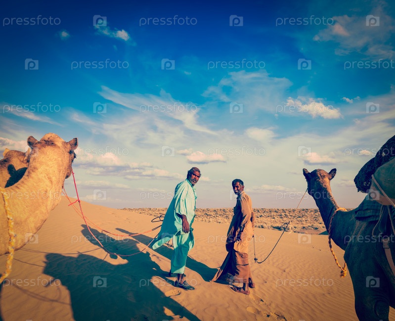 Винтажное ретро-хипстерское изображение путешествия в Раджастхане - два индийских погонщика верблюдов (погонщиков верблюдов) с верблюдами в дюнах пустыни Тар. Джайсалмер, Раджастхан, Индия