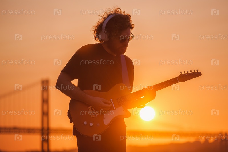 Уличный музыкант играет на электрогитаре на улице