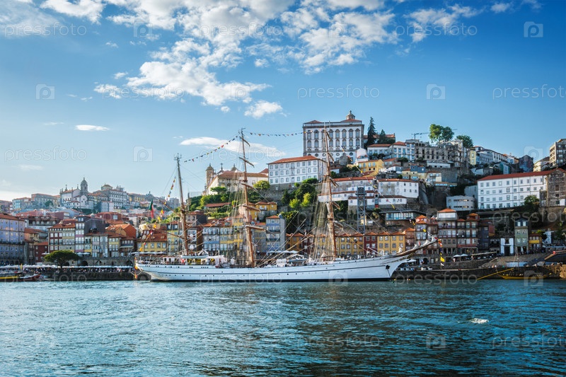 Вид на город Порту и реку Дору с парусного корабля со знаменитой туристической смотровой площадки Маргиналь-де-Гайя. Порту, Вила-Нова-де-Гайя, Португалия