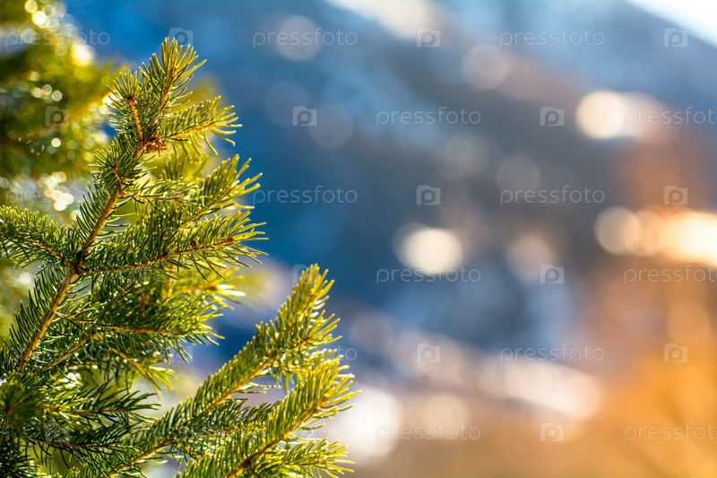 Еловые иголки в солнечном свете, боке, избирательный фокус