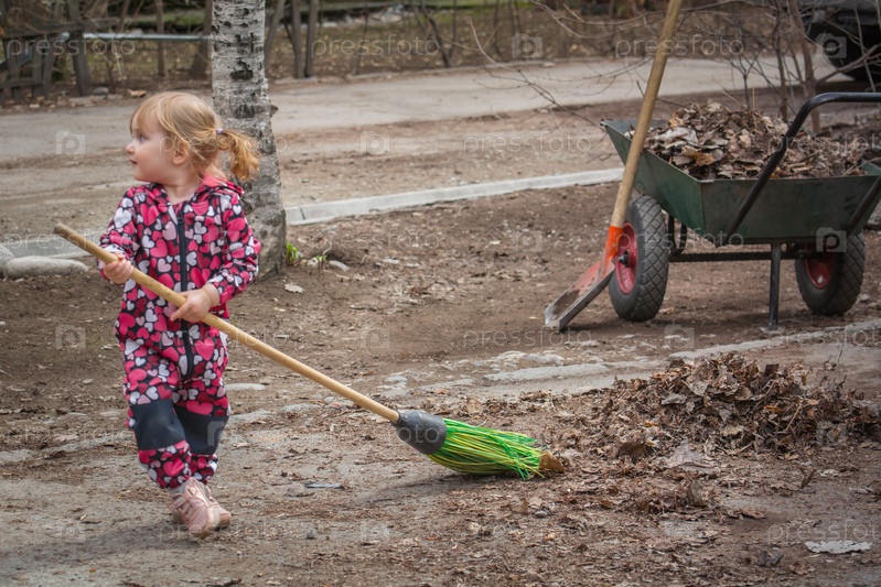 3-летняя девочка с метлой удаляет листья весной