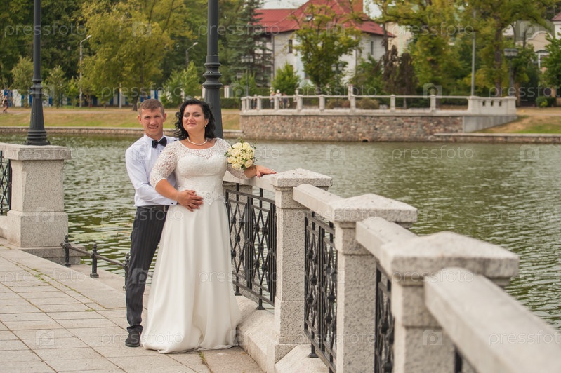 Молодожены, жених и невеста на свадьбе возле пруда