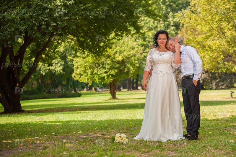 Жених и невеста смотрят друг на друга и нежно ласкают руками