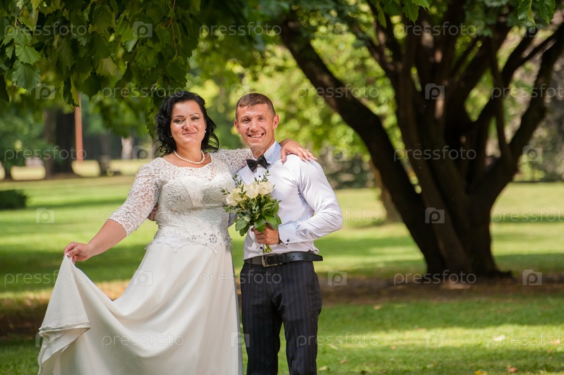 Молодая пара на свадебной фотосессии, на улице, портрет до пояса
