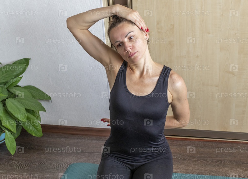 Снимок женщины, выполняющей различные упражнения на растяжку и физические упражнения, лежащей на коврике для йоги на полу. Стиль жизни