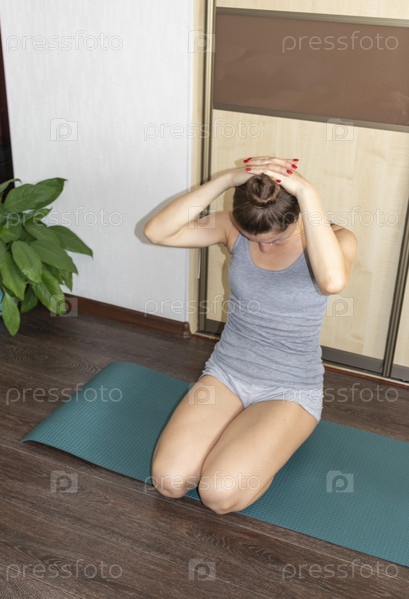 Снимок женщины, выполняющей различные упражнения на растяжку и физические упражнения, лежащей на коврике для йоги на полу. Стиль жизни