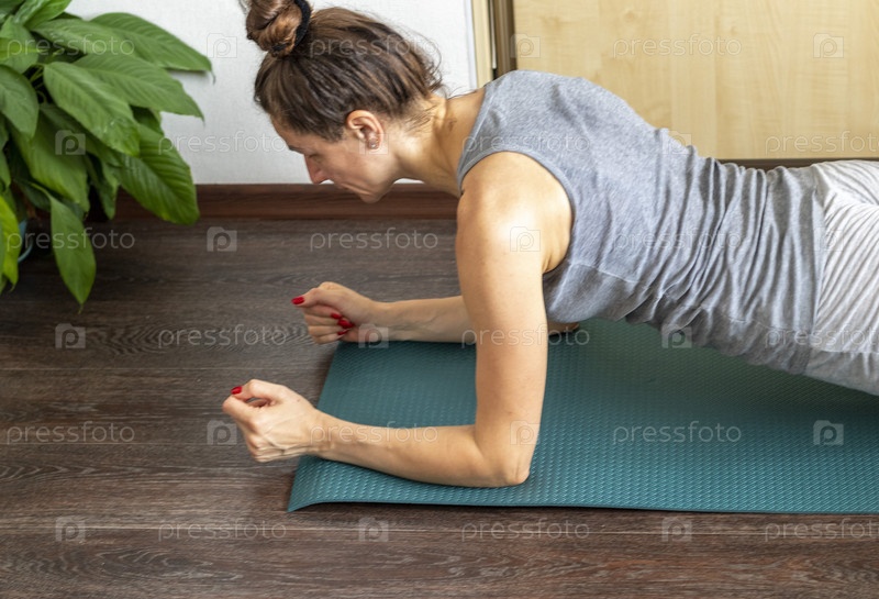 Снимок женщины, выполняющей различные упражнения на растяжку и физические упражнения, лежащей на коврике для йоги на полу. Стиль жизни