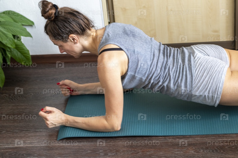 Снимок женщины, выполняющей различные упражнения на растяжку и физические упражнения, лежащей на коврике для йоги на полу. Стиль жизни